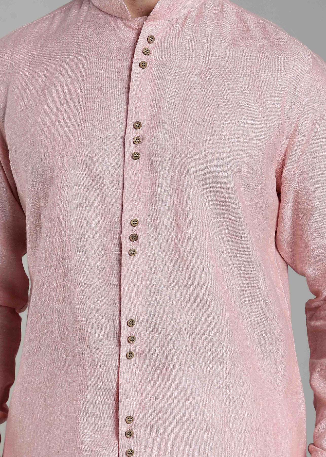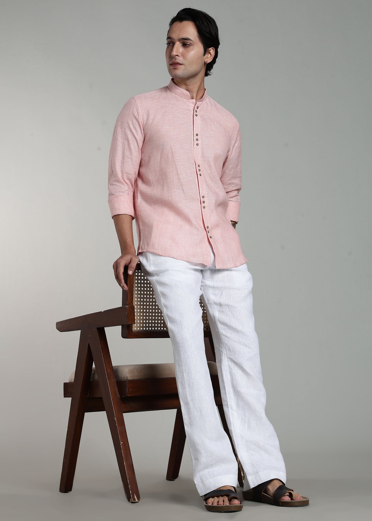 Flint - Pure Linen Shirt with Mandarin Collar & Trio Button Detail - Pink Chambray