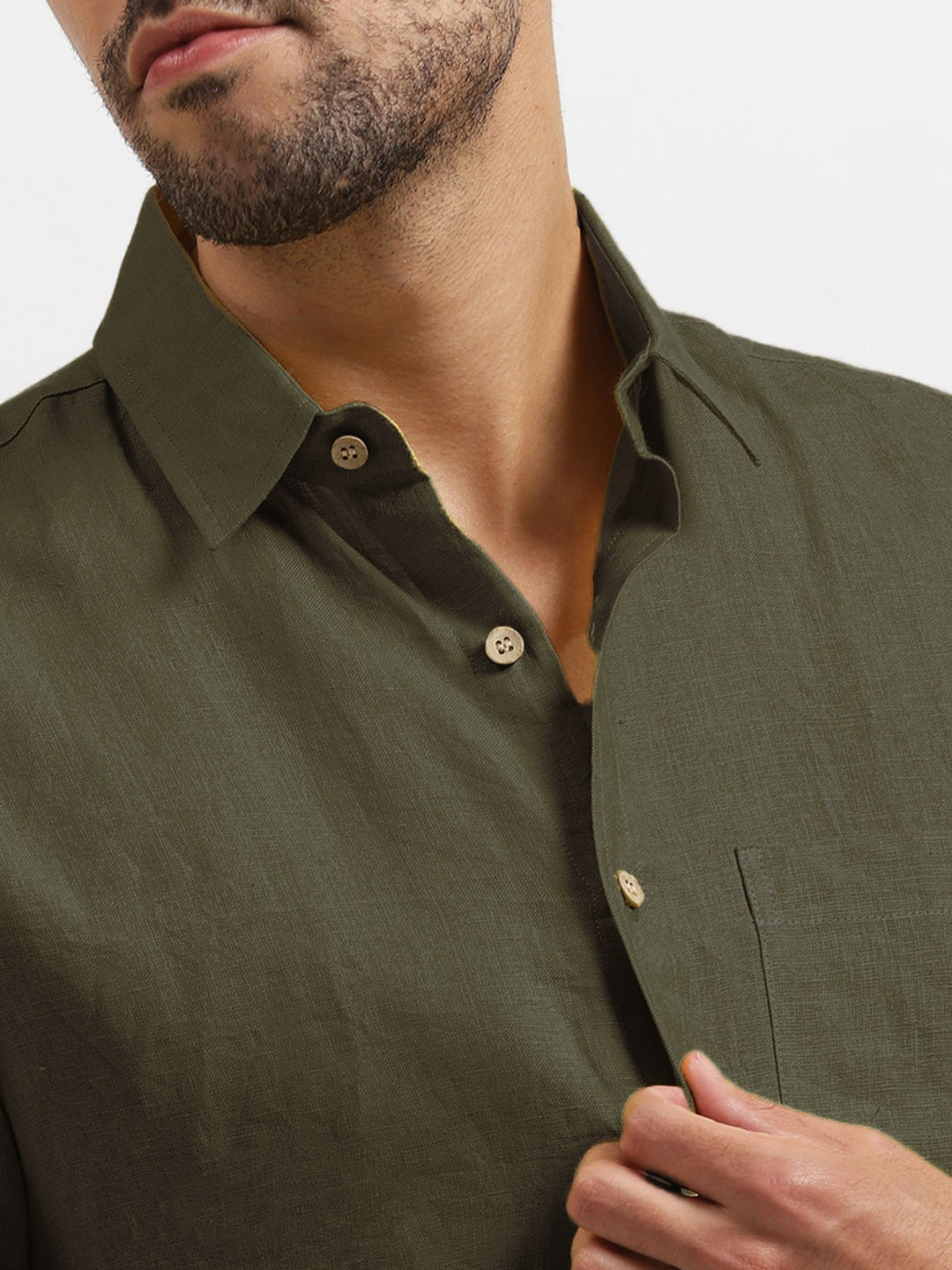 This is a black long-sleeve pure linen shirt with a regular collar. A linen staple from our classic collection of timeless linen wear.