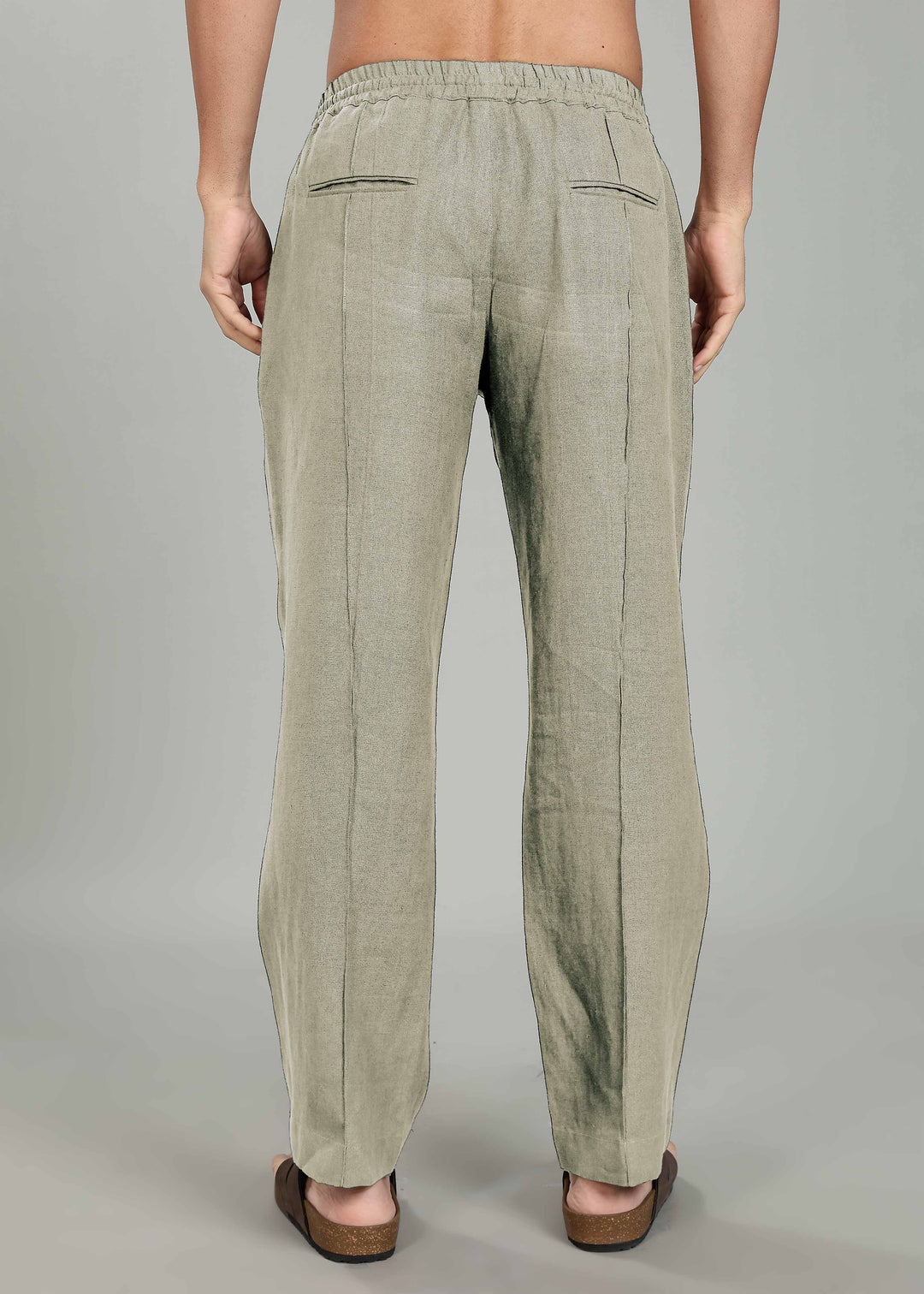 Art Pants - Pure Linen Elastic Casual Pants with Drawstrings - Artichoke Green