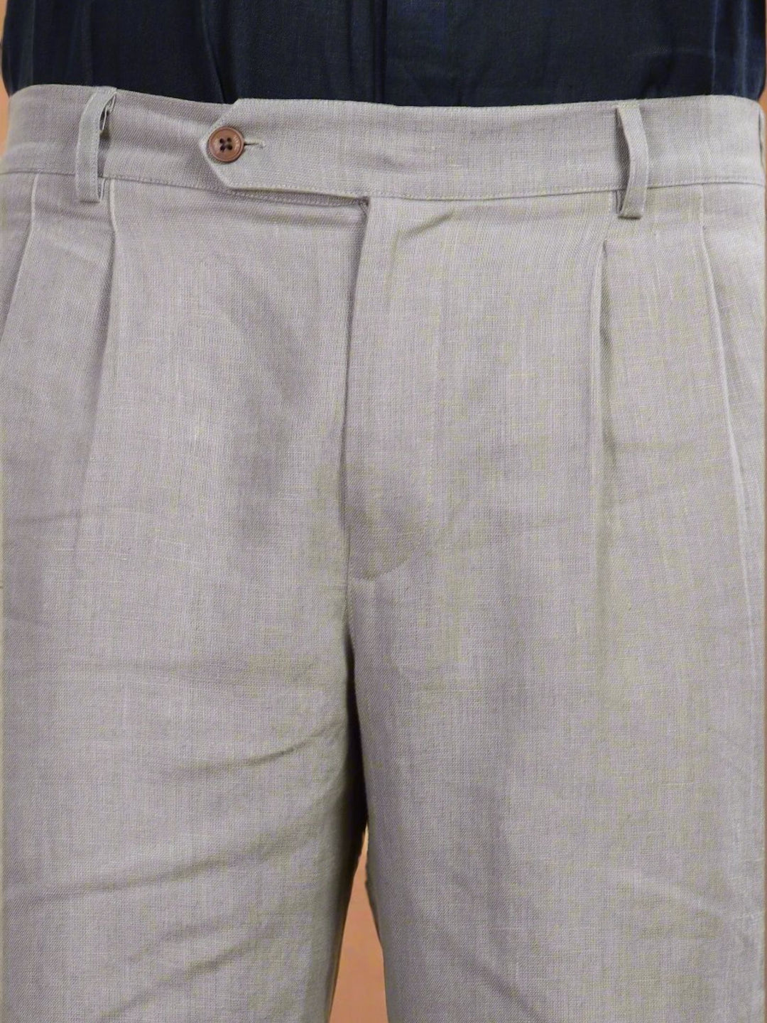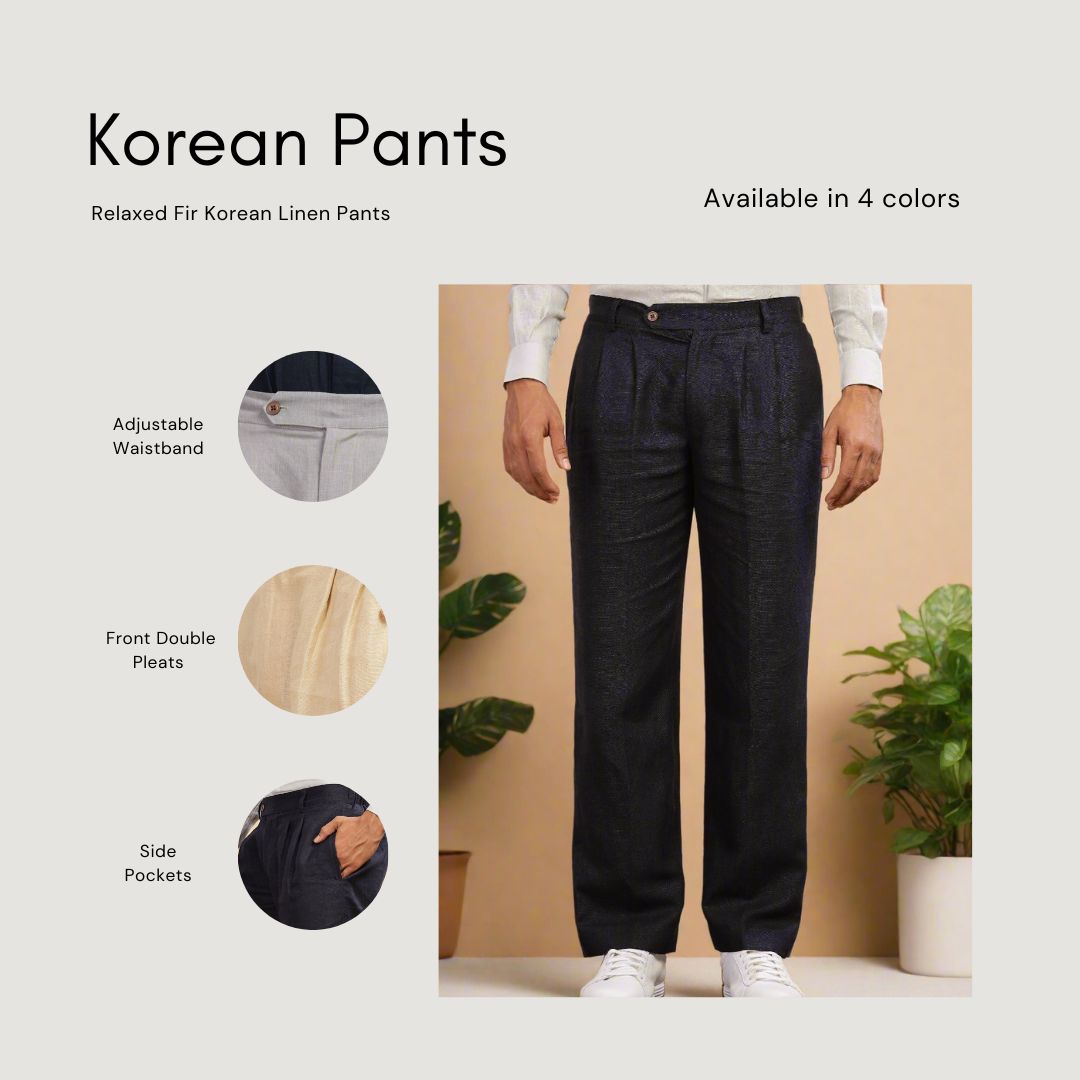 Introducing our Pure Linen Korean Fit Pleated Pants, featuring a sleek, tailored silhouette with subtle pleats for a modern look. Inspired by Korean fashion, these pants offer a clean, tapered fit and breathable comfort, perfect for both casual and semi-formal occasions.