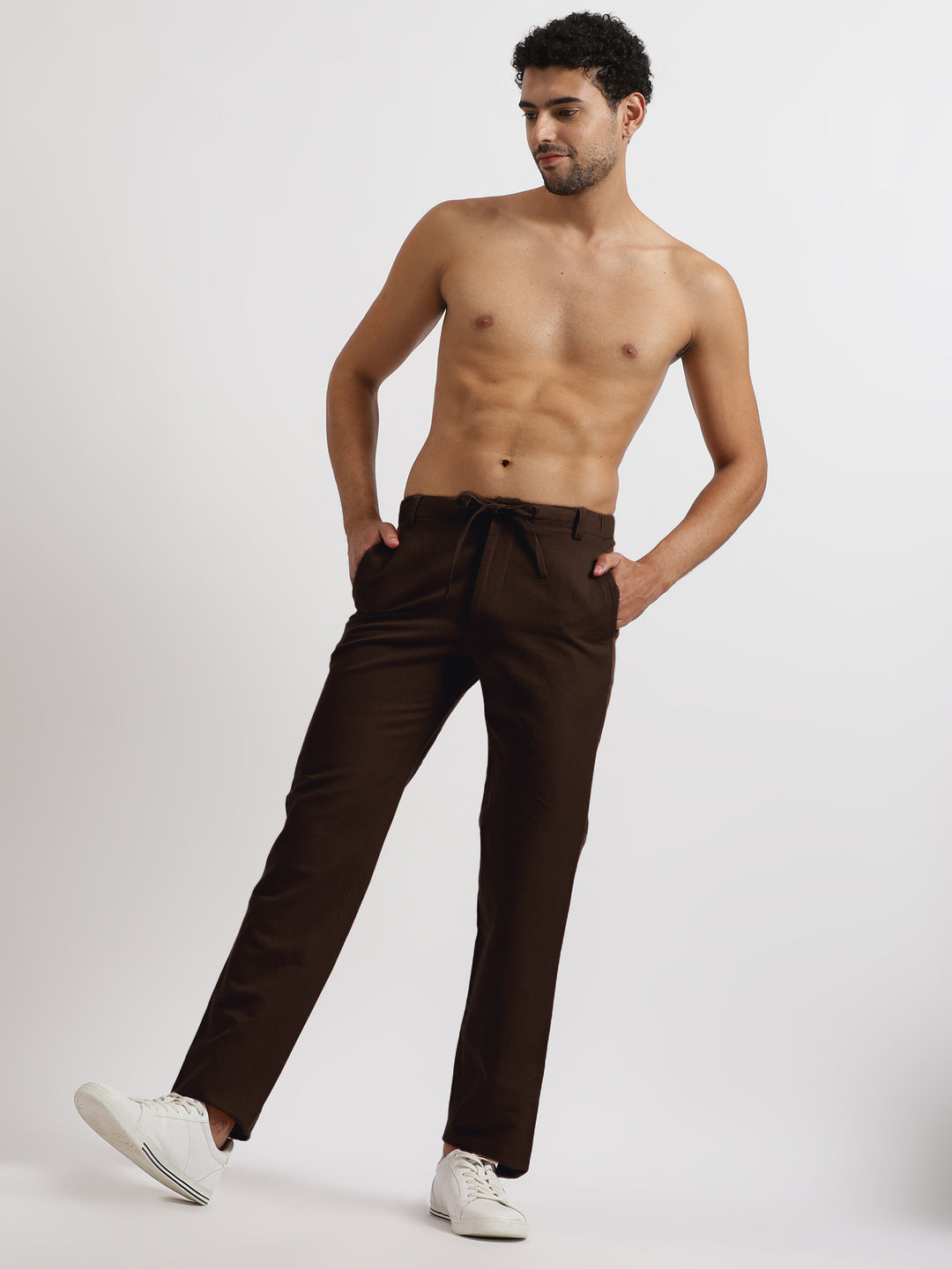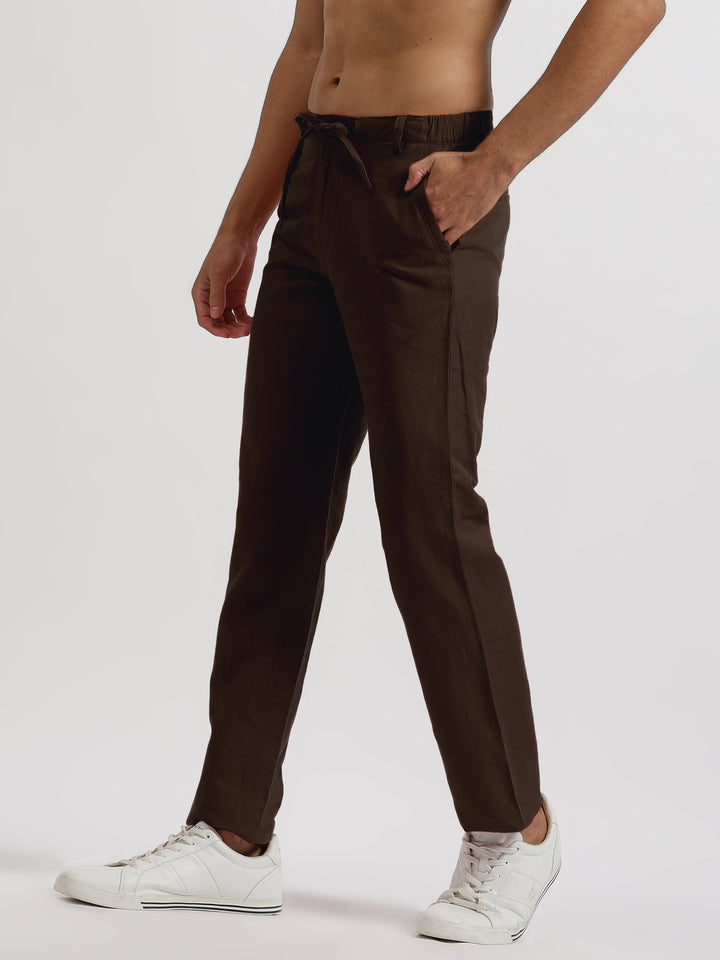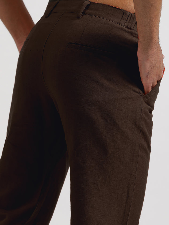 Cocoa Brown relaxed-fit 4-pocket linen travel pants with side elastic. Your perfect travel companion.
