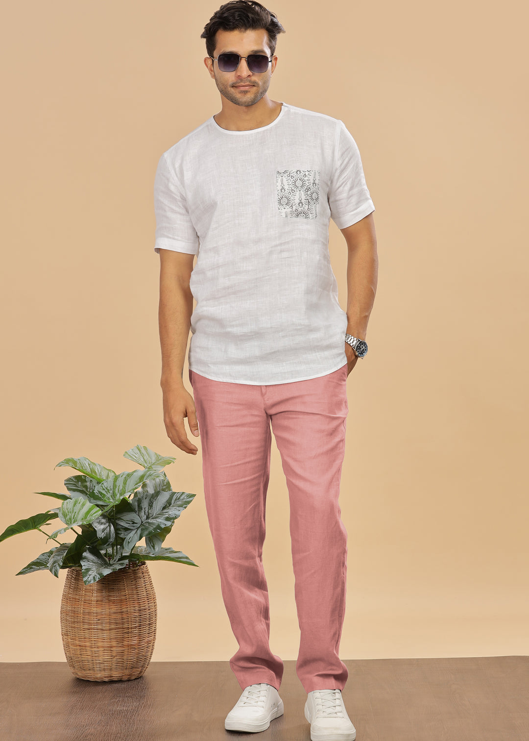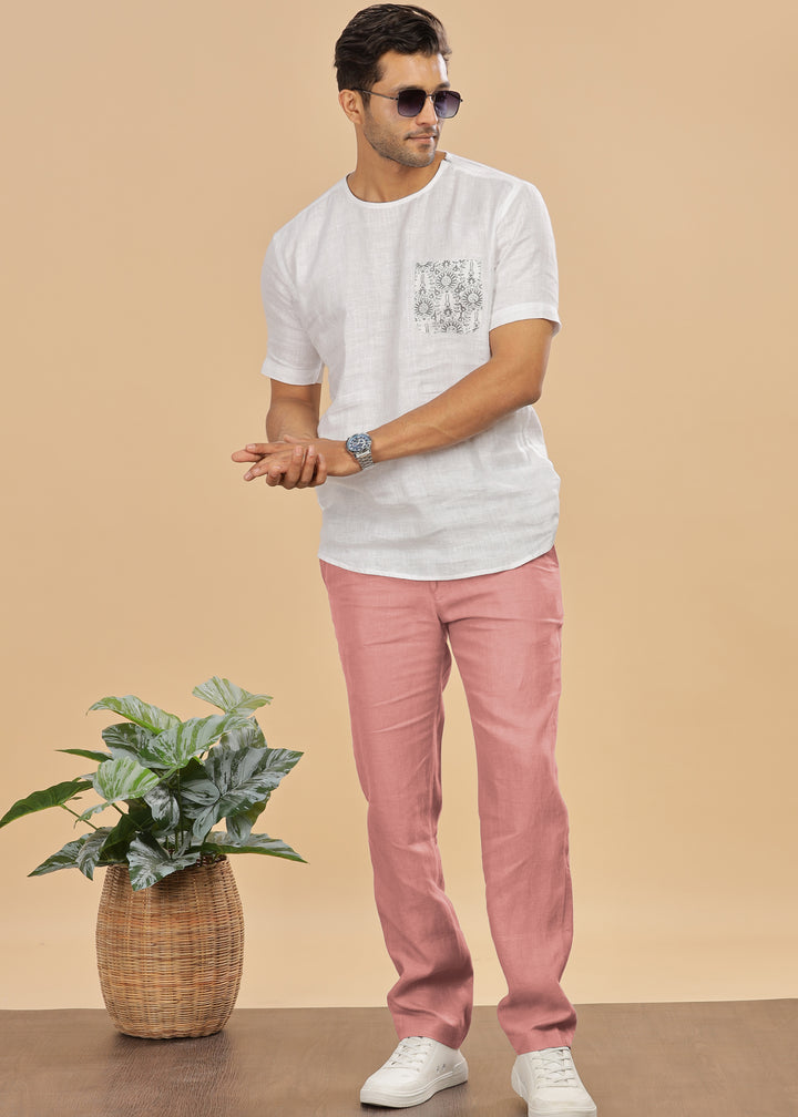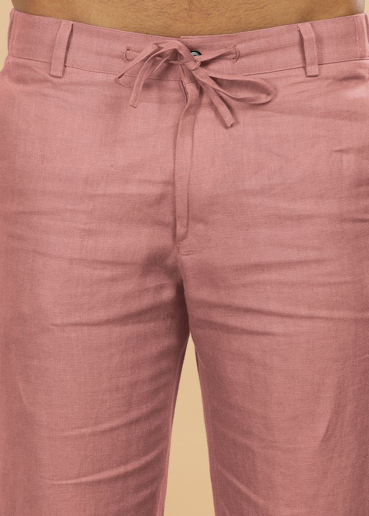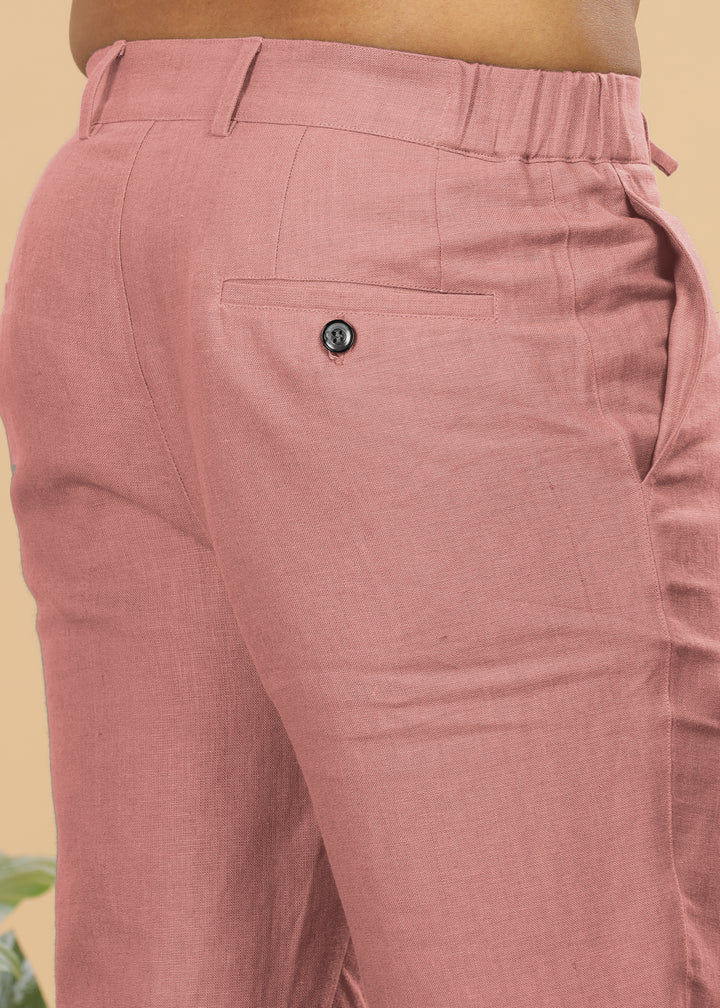 Introducing the Theo - Linen Travel Pants in Rose Pink. These tailored fit pants feature 4 pockets and side elastic, making them the perfect travel companion. Stay comfortable and stylish on-the-go in these versatile linen pants.