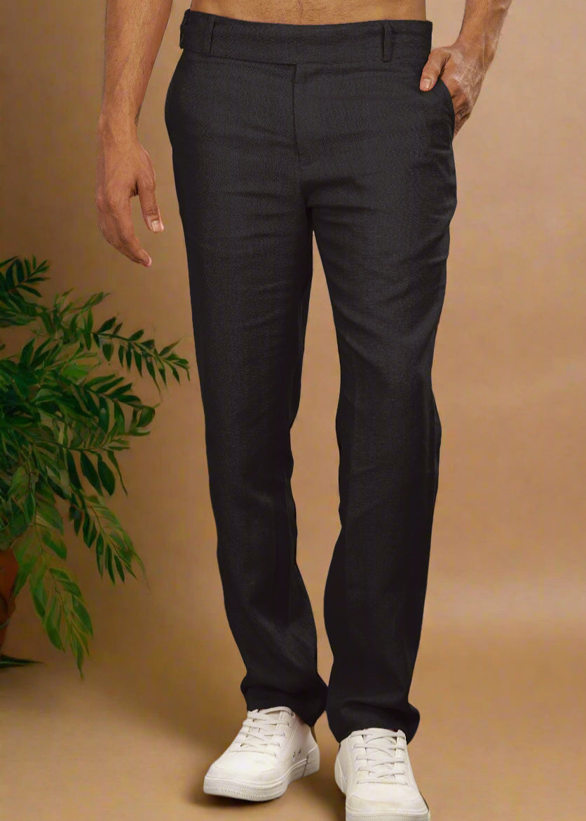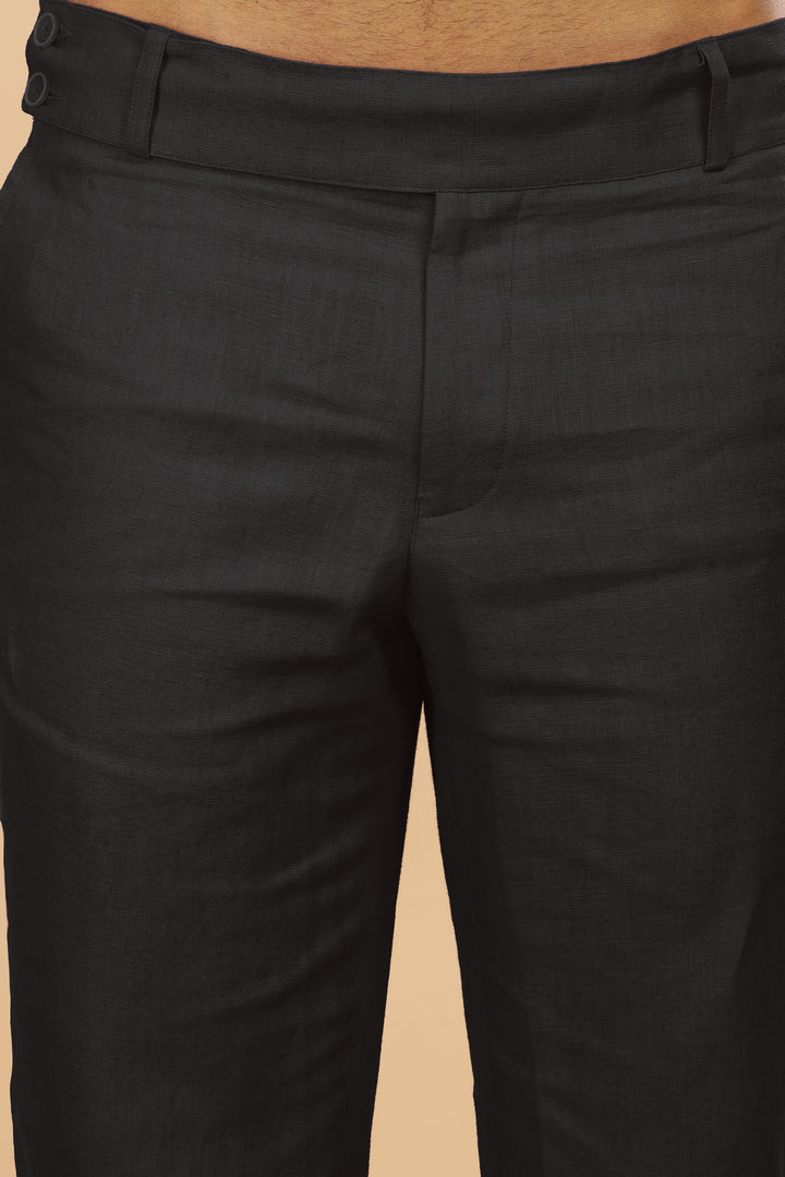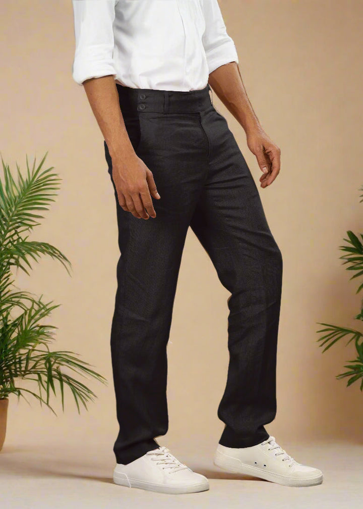 Double button broad waistband linen trousers in Military Green offer timeless style and comfort for all seasons. The broadband and adjustable double buttons enhance the overall comfort while pairing them with our 100% Pure Linen Shirts creates a polished look.