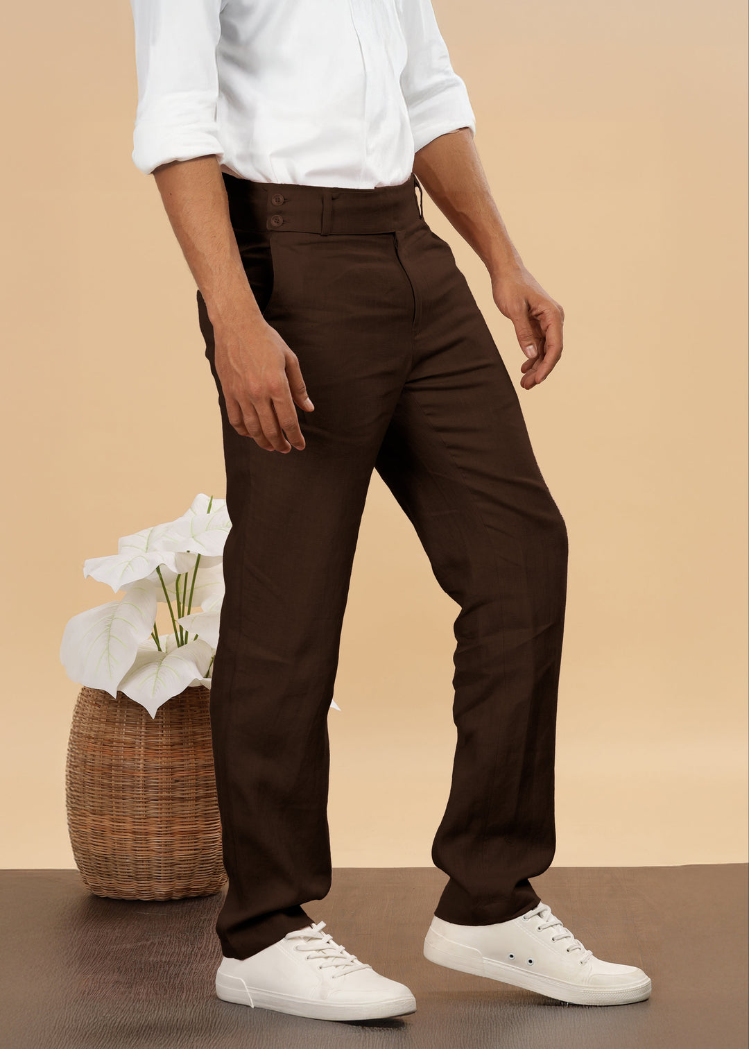 Double button broad waistband linen trousers in Military Green offer timeless style and comfort for all seasons. The broadband and adjustable double buttons enhance the overall comfort while pairing them with our 100% Pure Linen Shirts creates a polished look.