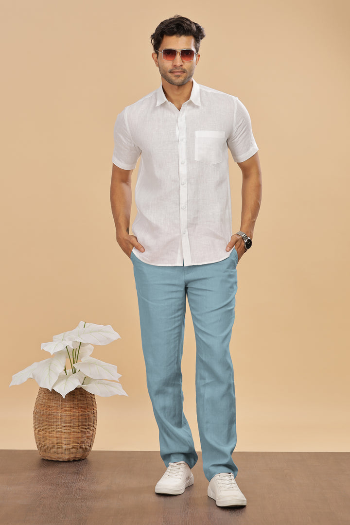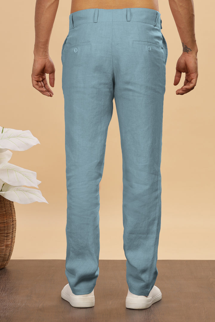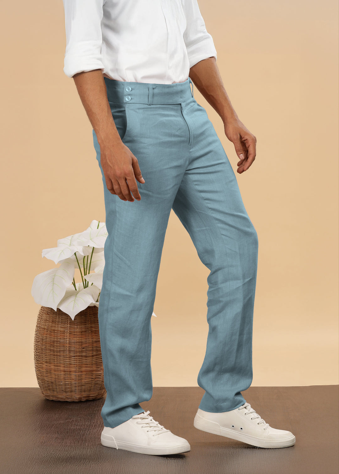 Brandon Double Button Broad Pure Linen Trousers - Light Blue Grey