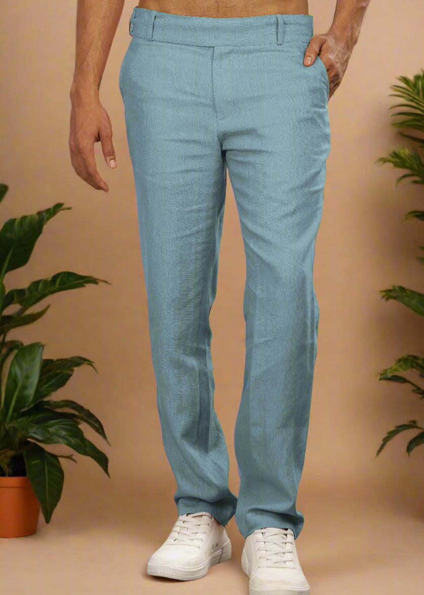 Double button broad waistband linen trousers in Military Green offer timeless style and comfort for all seasons. The broadband and adjustable double buttons enhance the overall comfort while pairing them with our 100% Pure Linen Shirts creates a polished look.