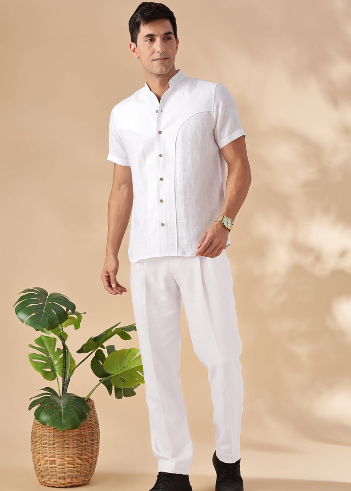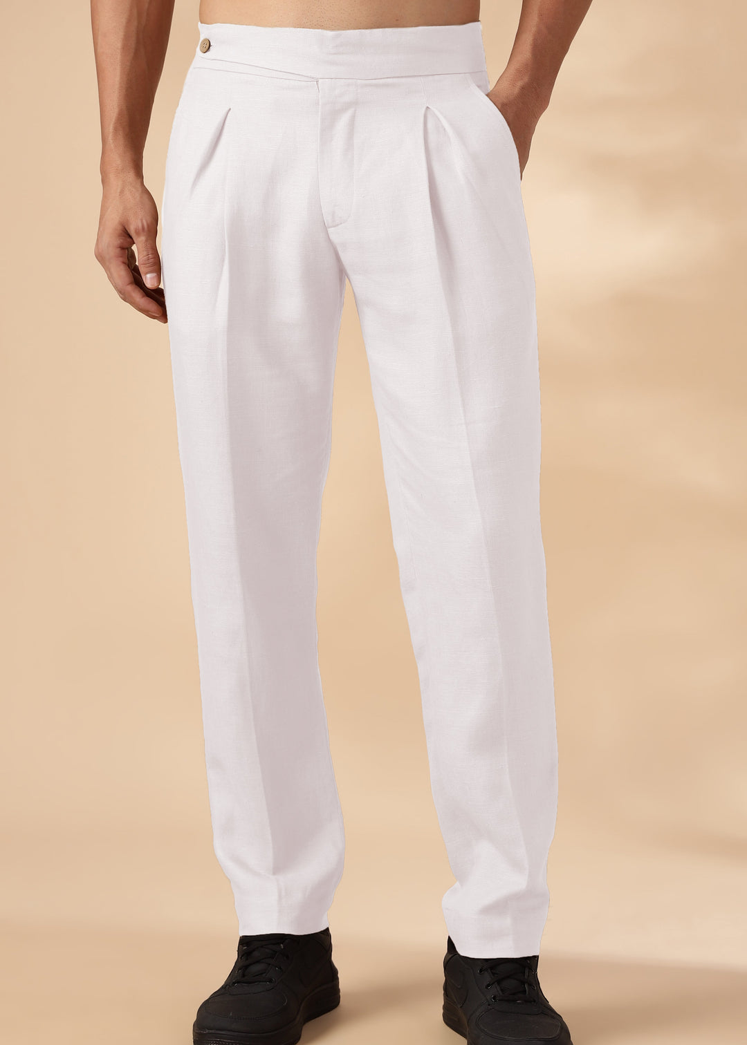 Expertly crafted from 100% pure linen, these Foster trousers are a must-have for any formal occasion. With double pleats in the front and a stylized waistband, they offer a sophisticated and polished look. Elevate your wardrobe with these White formal pants.