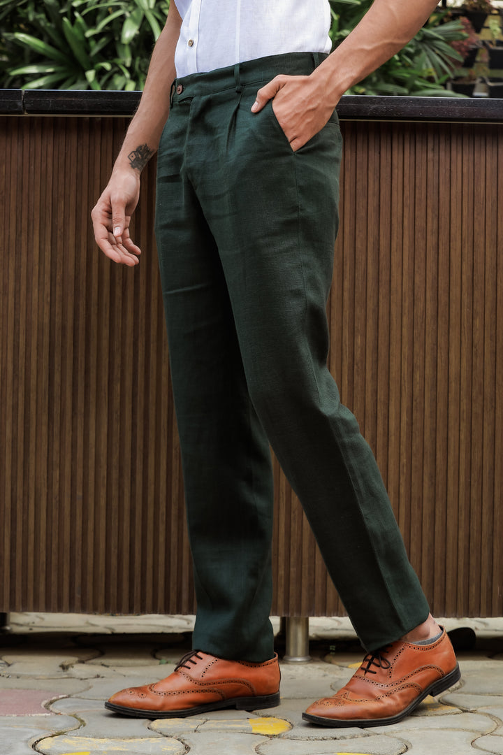 Classic pleated linen trousers in dark green offer timeless style and comfort for all seasons. The front pleats ensure ease of movement, while pairing them with our 100% Pure Linen Shirts creates a polished look.