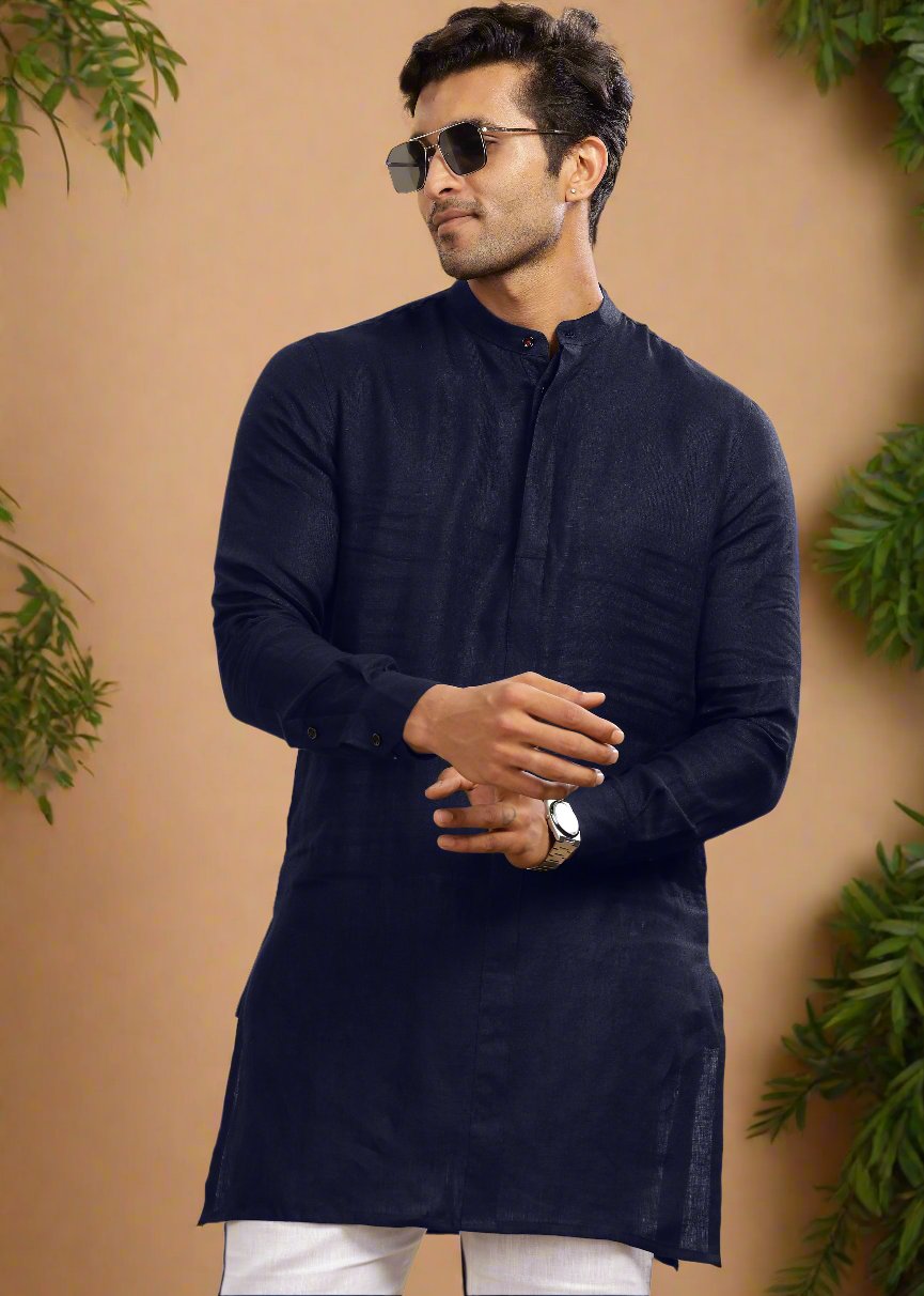 An ideal option for evening events, the Wills Kurta in deep navy offers elegance with edge. Add a contrast ecru or maroon linen jacket for a power-packed ensemble.