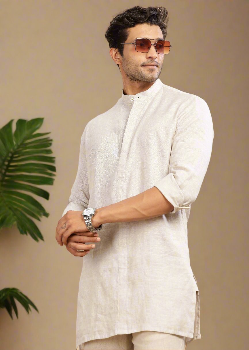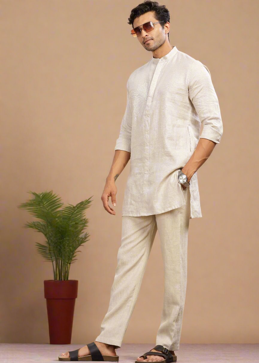 Here are three popular kurtas from our collection that blend seamlessly into the linen kurta pajama with jacket aesthetic: