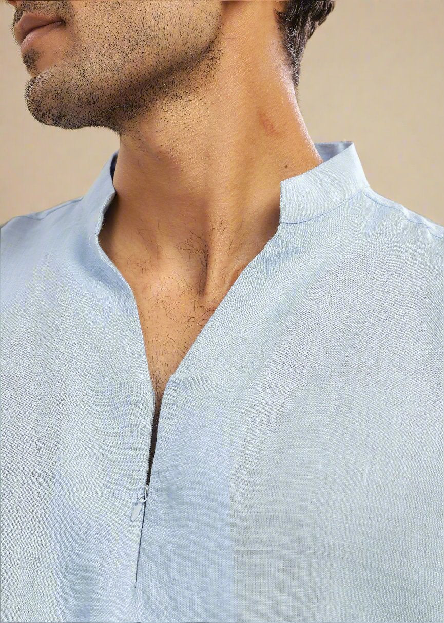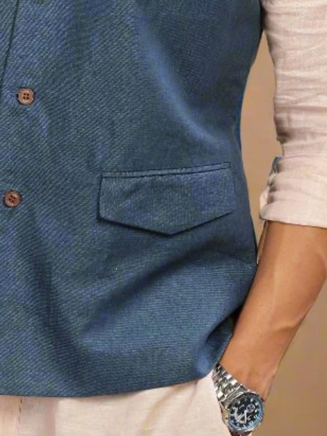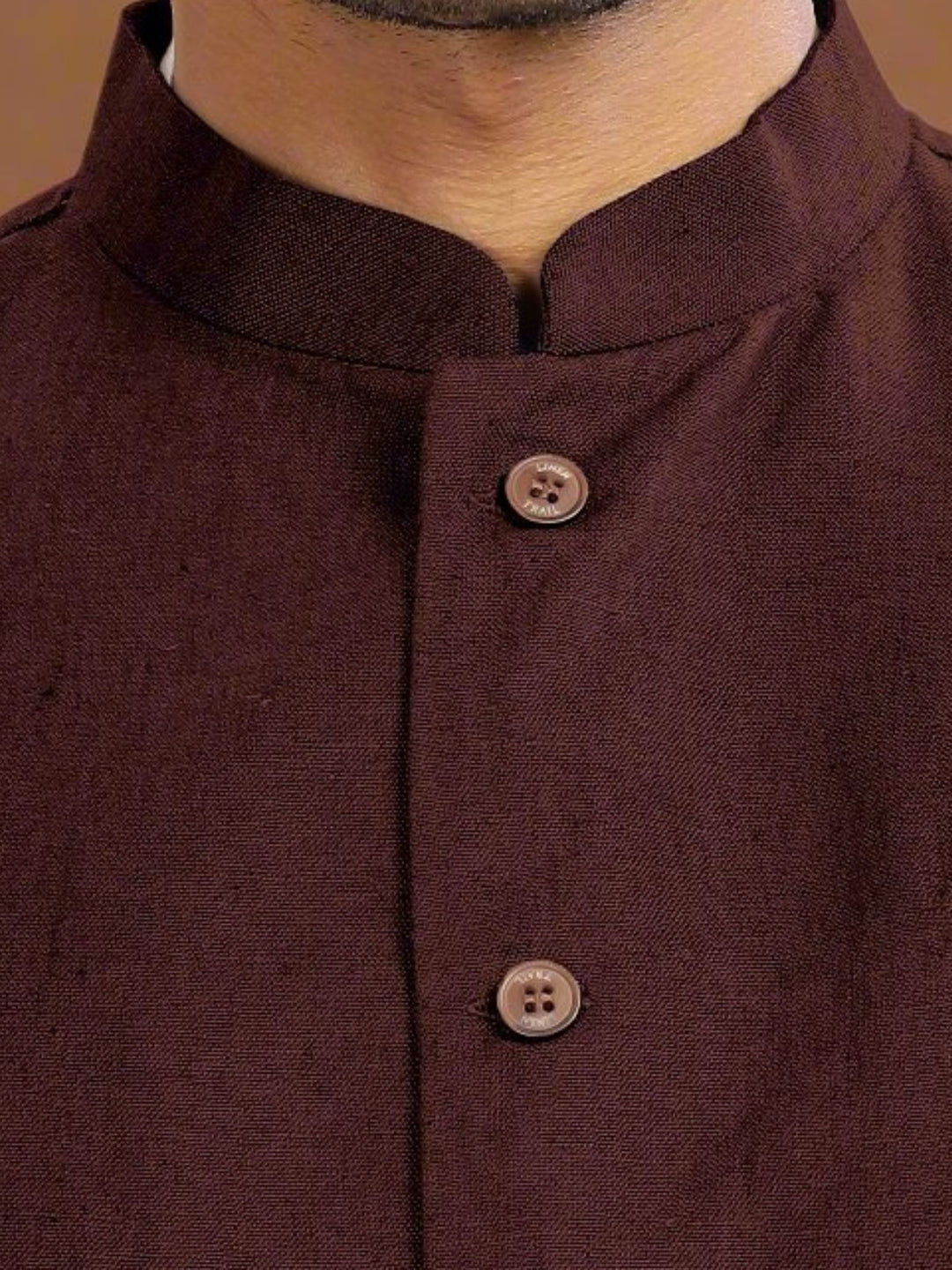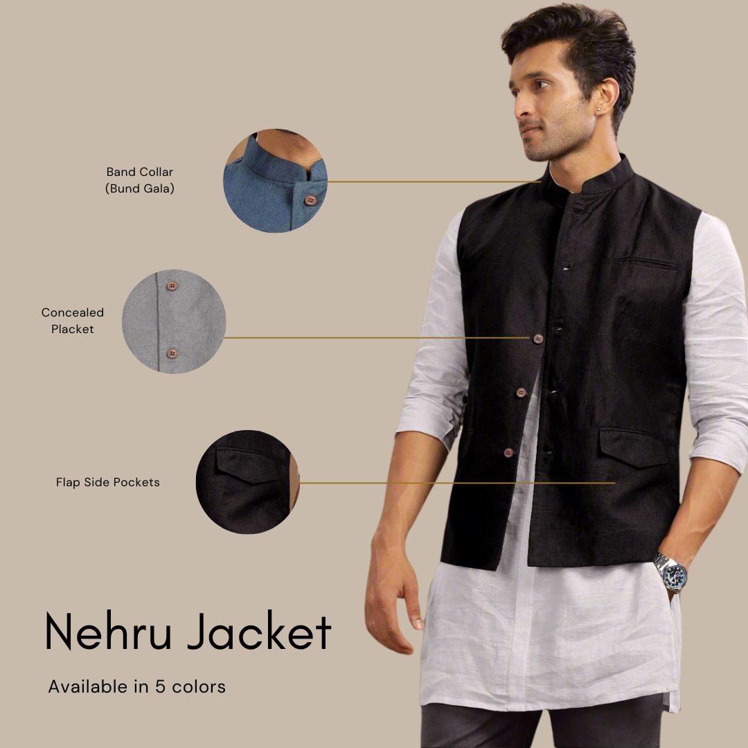 Expertly crafted from pure linen, the Nehru Pure Linen Jacket adds a touch of elegance to any traditional outfit. Designed to be worn over a kurta, this Black jacket is perfect for any festive occasion. Elevate your style with this refined and timeless piece.