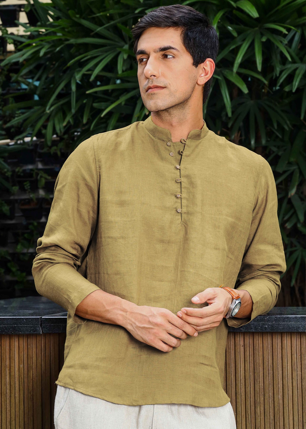 Shurta - Pure Linen Full Sleeve Short Kurta Shirt - Sunburst Yellow