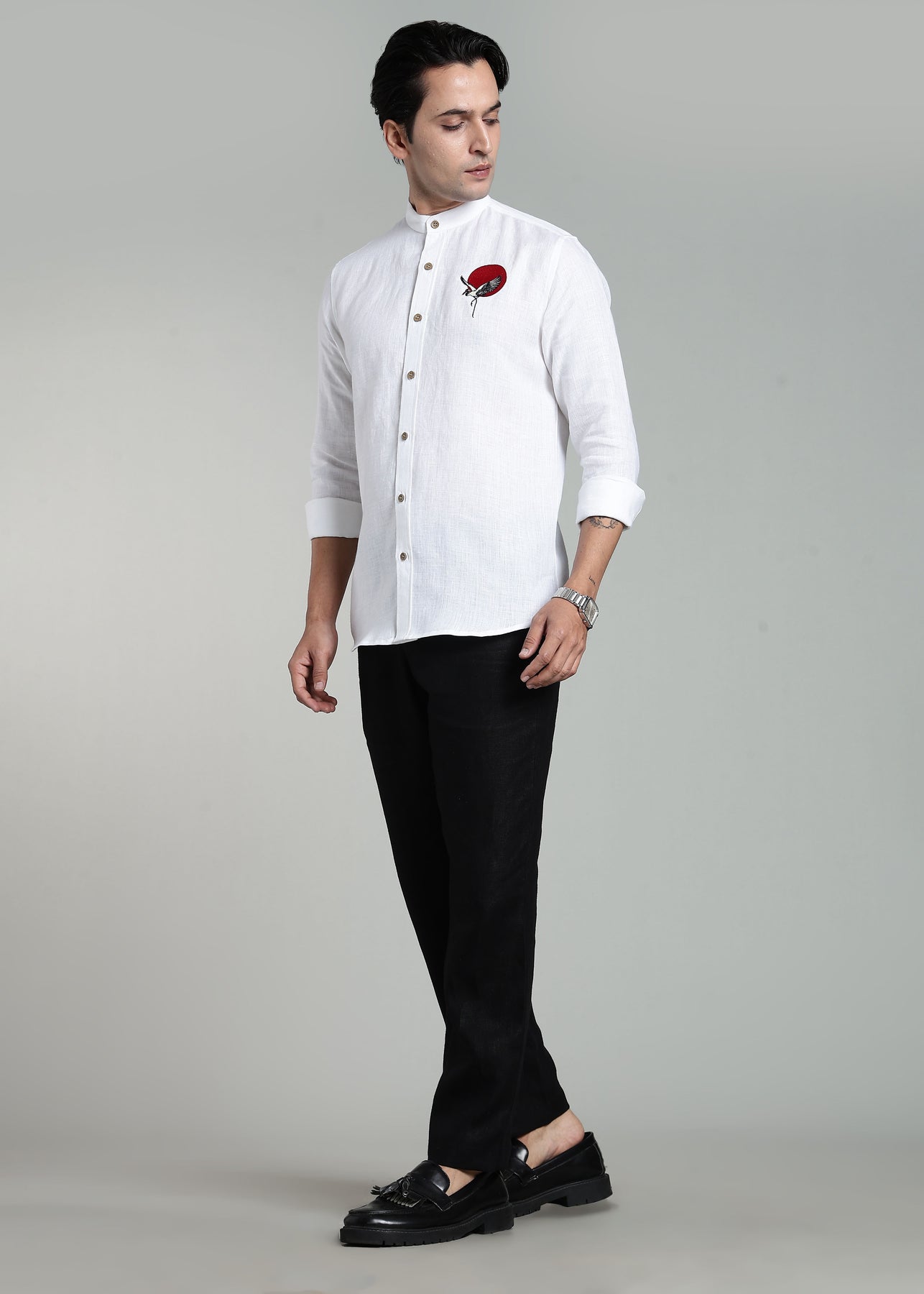 Asahi, a full-sleeve pure linen shirt inspired by the spirit of Japan. Featuring a minimal mandarin collar and a striking embroidered motif of a crane soaring before the rising sun, symbolizing hope and renewal. Crafted in pristine white linen for a crisp, serene aesthetic that blends tradition with modern refinement.