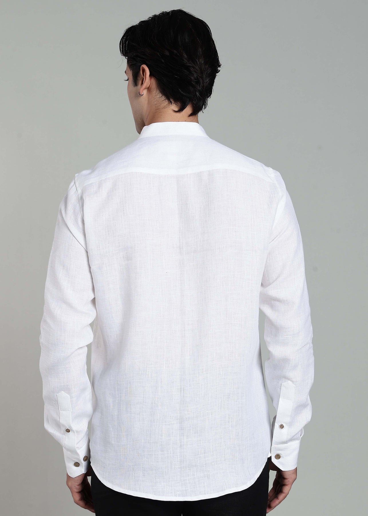 Asahi - Pure Linen Full Sleeve Mandarin Collar Embroidered Shirt - White