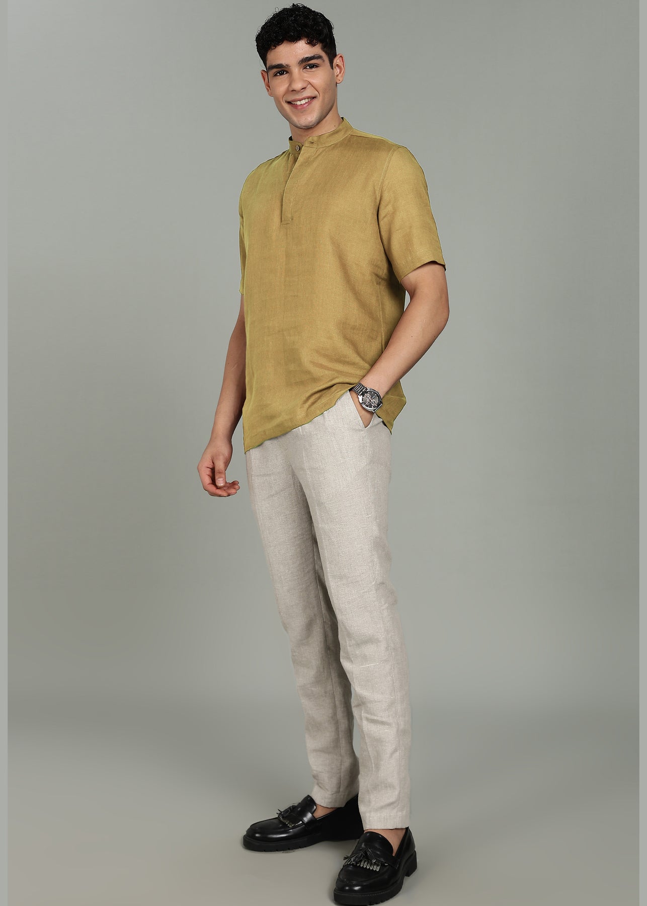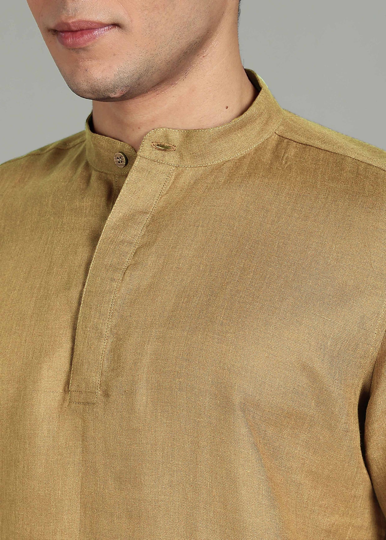 Neo - Pure Linen Shirt with Mandarin Collar & Hidden Placket - Golden Olive Green