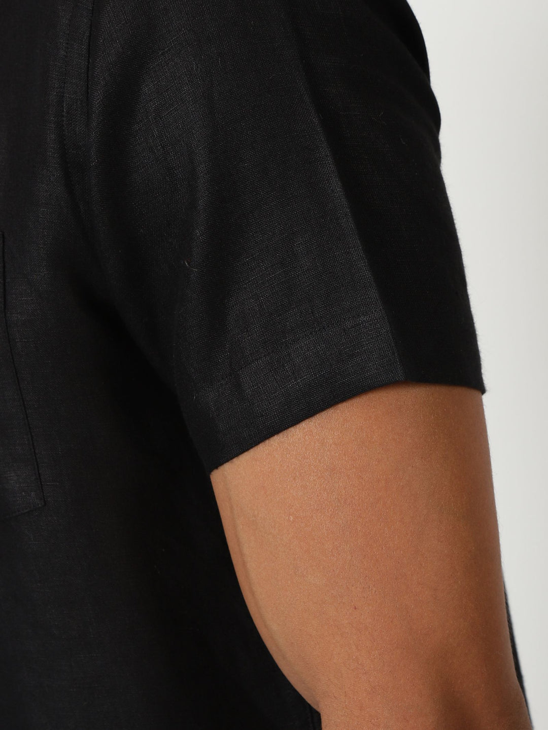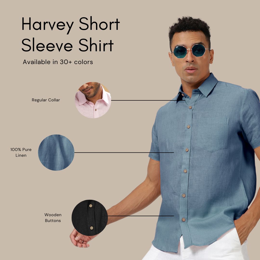 This is a Light Pink short-sleeve pure linen shirt with a regular collar. A versatile piece that can be styled with any trousers or chinos. A linen staple from our classic collection of timeless linen-wear.