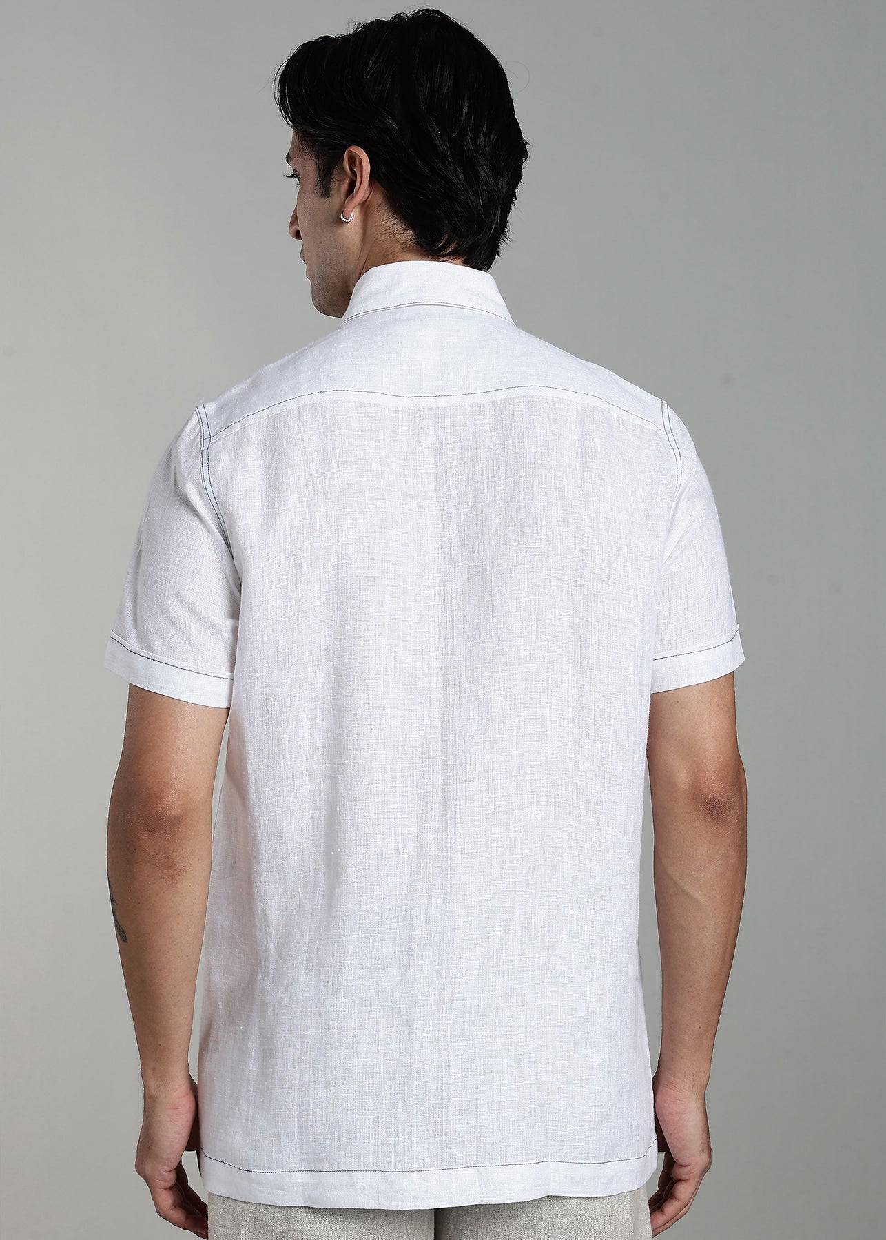 Eden, Pure linen half-sleeve shirt inspired by the white and blue tones of Mykonos. Designed with a classic collar and two front patch pockets, featuring contrast Egyptian blue stitch detailing along the seams. A relaxed yet refined piece that captures the island’s effortless charm.