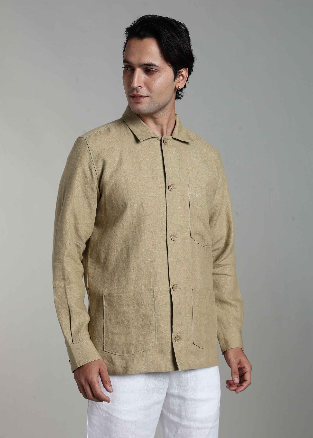 Jade, a pure linen shacket in soft sage green, designed for versatile layering and everyday function. Features front patch pockets and a relaxed silhouette, blending the ease of a shirt with the utility of a jacket — ideal for effortless resort styling.
