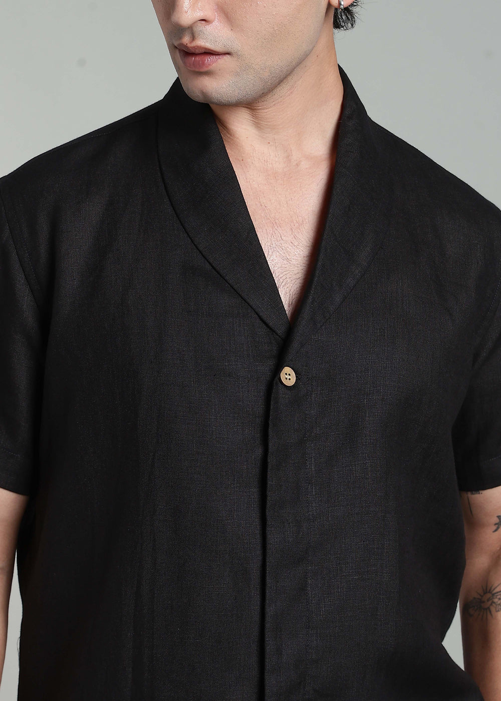 Cyrus - Pure Linen Half Sleeve Shawl Collar Shirt - Black