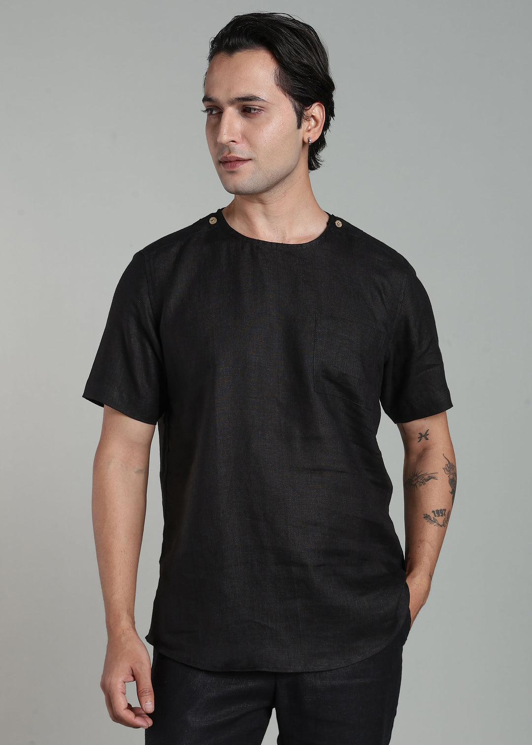Nero - Pure Linen T-Shirt with Side Double Button Closure – Black