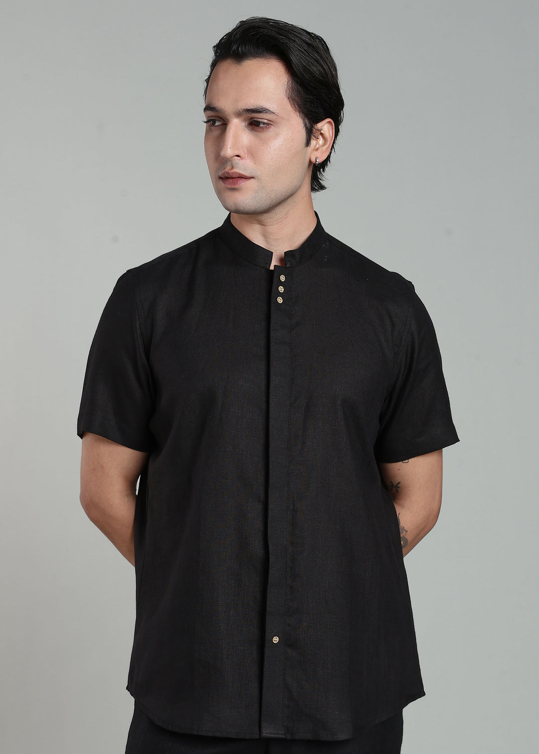 Void - Pure Linen Collarless Half Sleeve Shirt – Black
