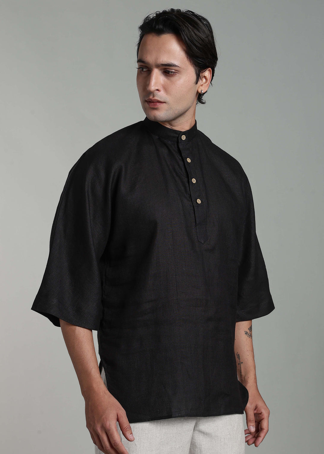 Sora - Three Quarter Sleeve Pure Linen Short Kimono Kurta - Black
