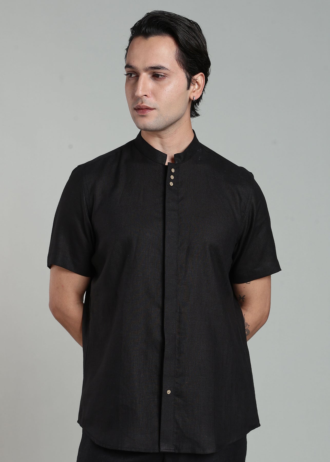 Mavro - Pure Linen Half Sleeve Shirt with Button Detail – Black