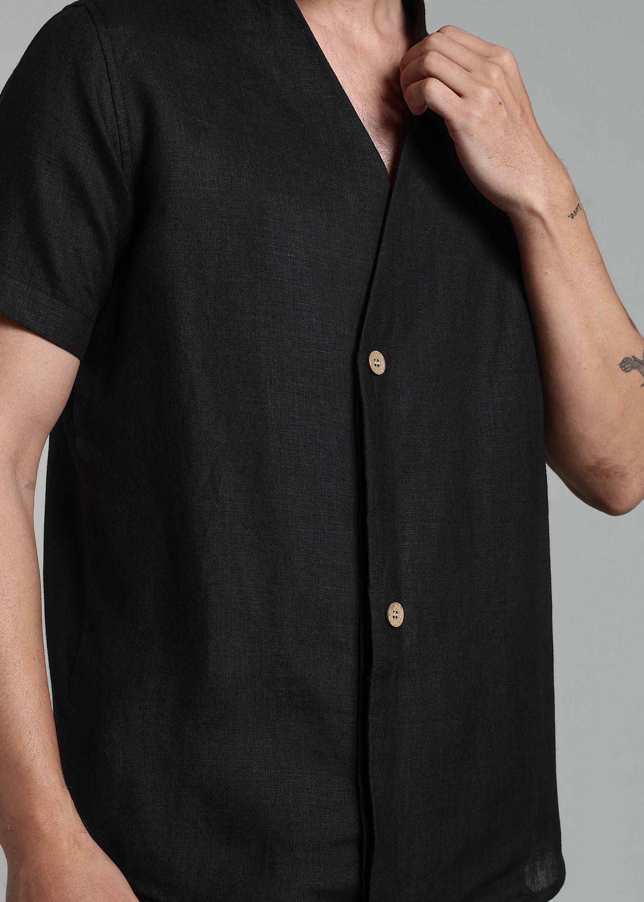 Void - Pure Linen Collarless Half Sleeve Shirt – Black