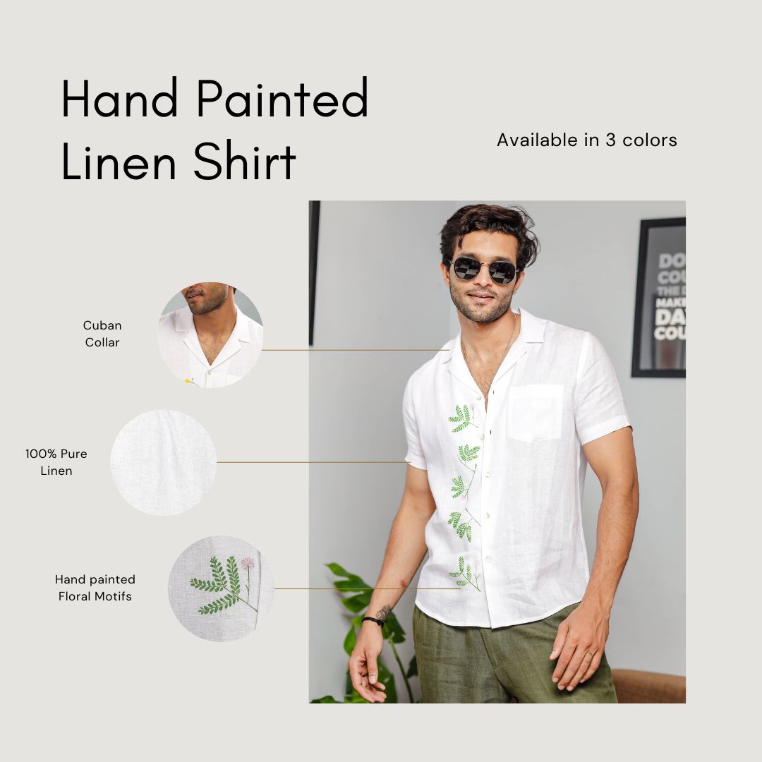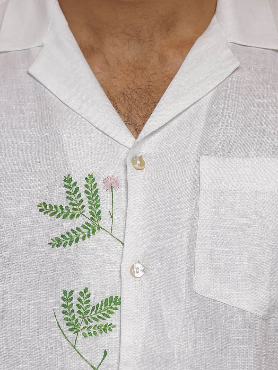 Hand-Painted Fern - Pure Linen Half Sleeve Shirt - White