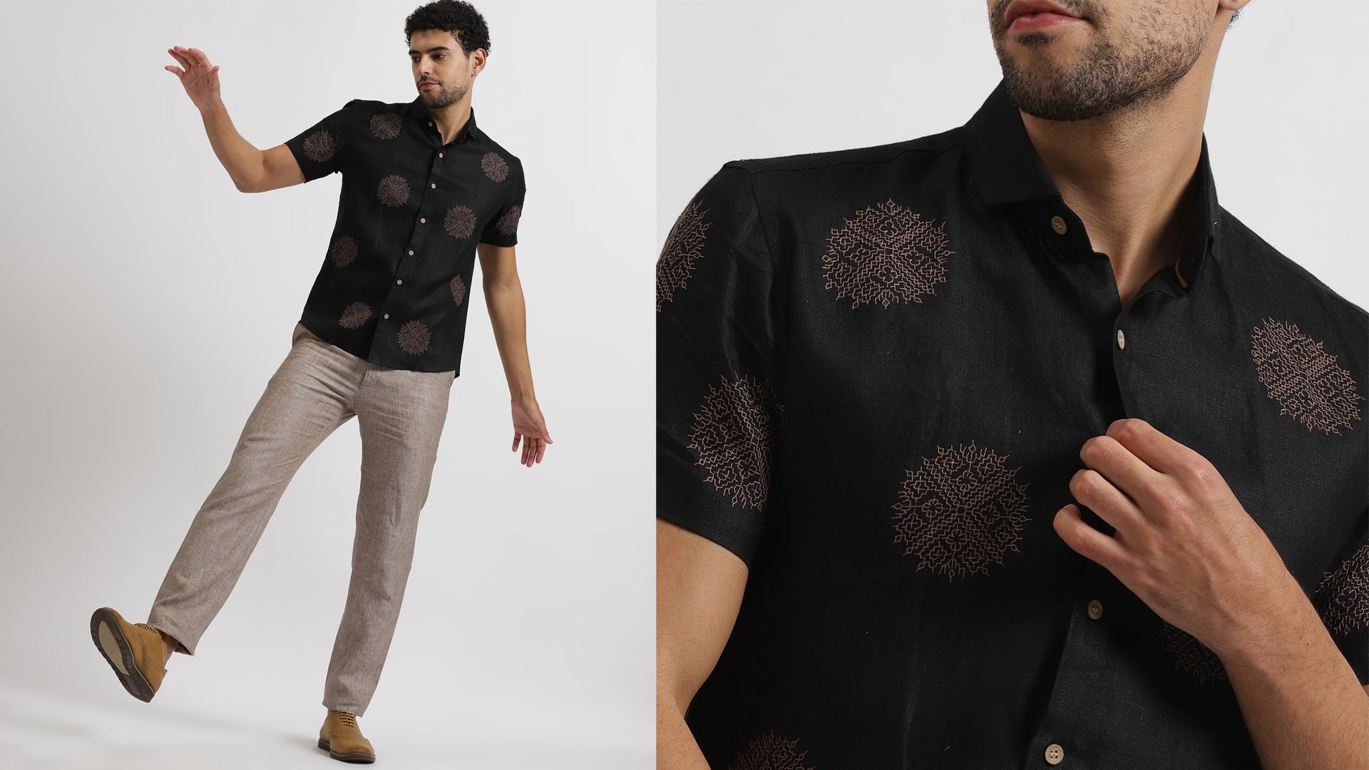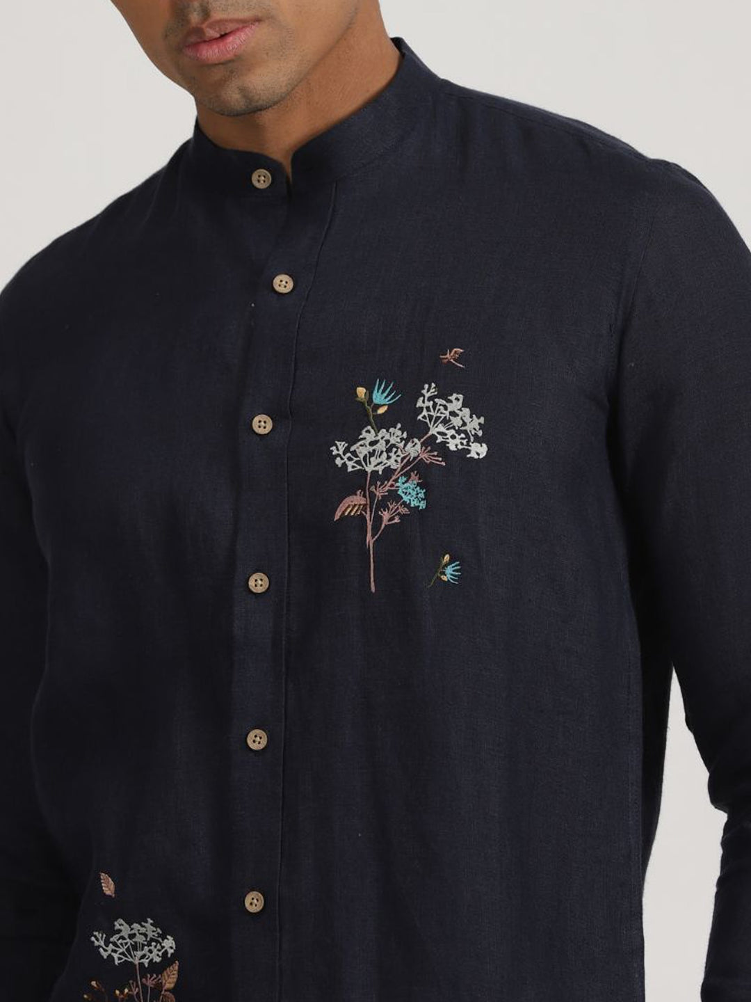 This is a mandarin collar, full-sleeved, white pure linen shirt placement embroidery details inspired by flora.