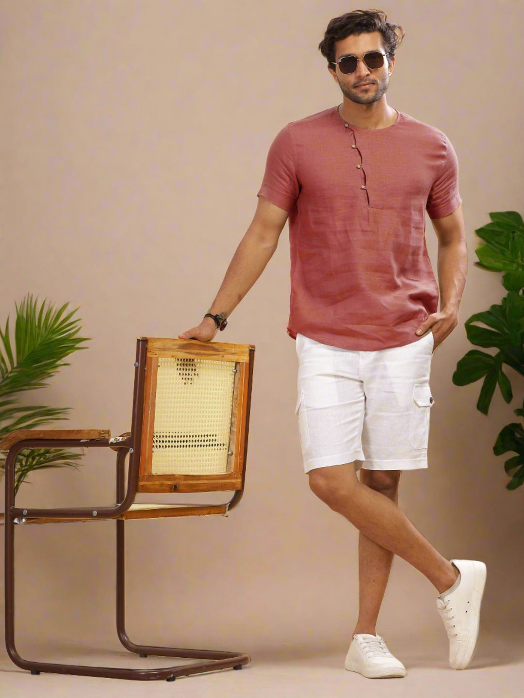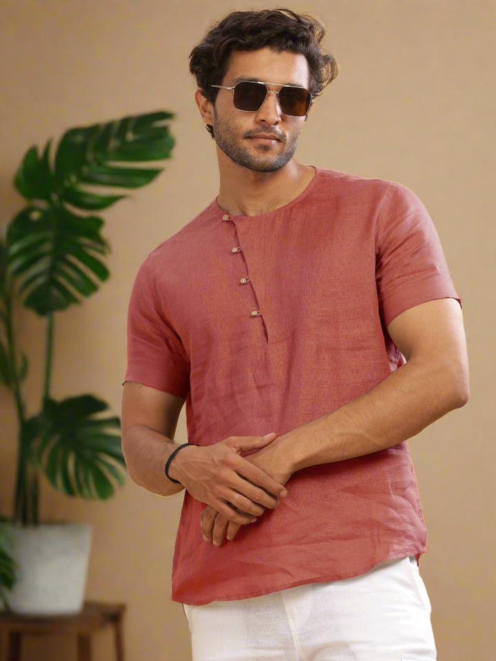 Evan - Pure Linen Short Sleeve T-Shirt - Terracotta Red