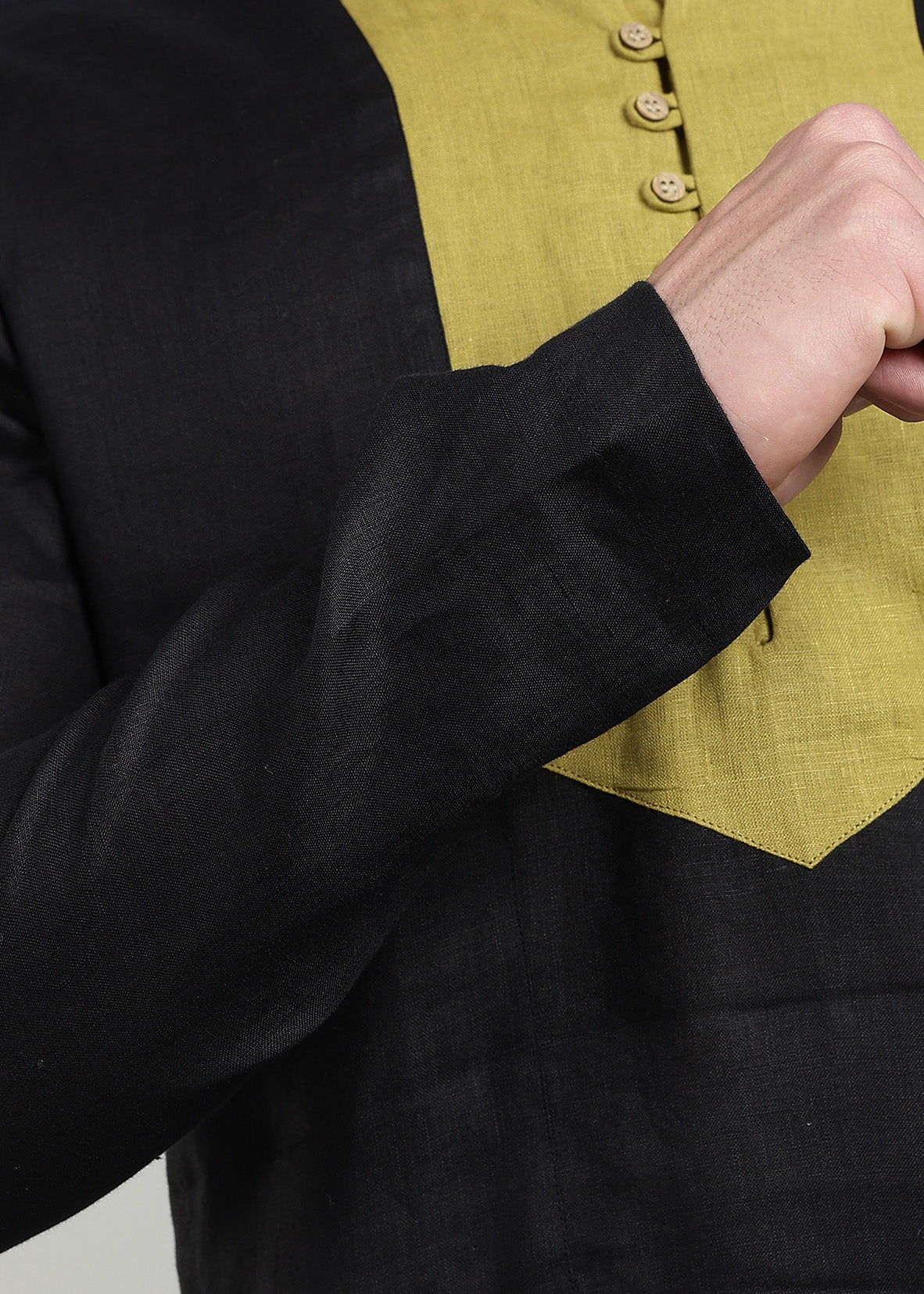 Elevate your everyday wardrobe with this sophisticated linen kurta, crafted from pure linen for breathability and comfort. The striking color-block design features a black base with a sap green front panel, creating visual interest while maintaining understated elegance. The mandarin collar adds a refined touch, while full sleeves provide versatile styling options for any season. Perfect for casual gatherings or relaxed professional settings, this piece combines timeless design with the natural qualities of premium linen fabric.