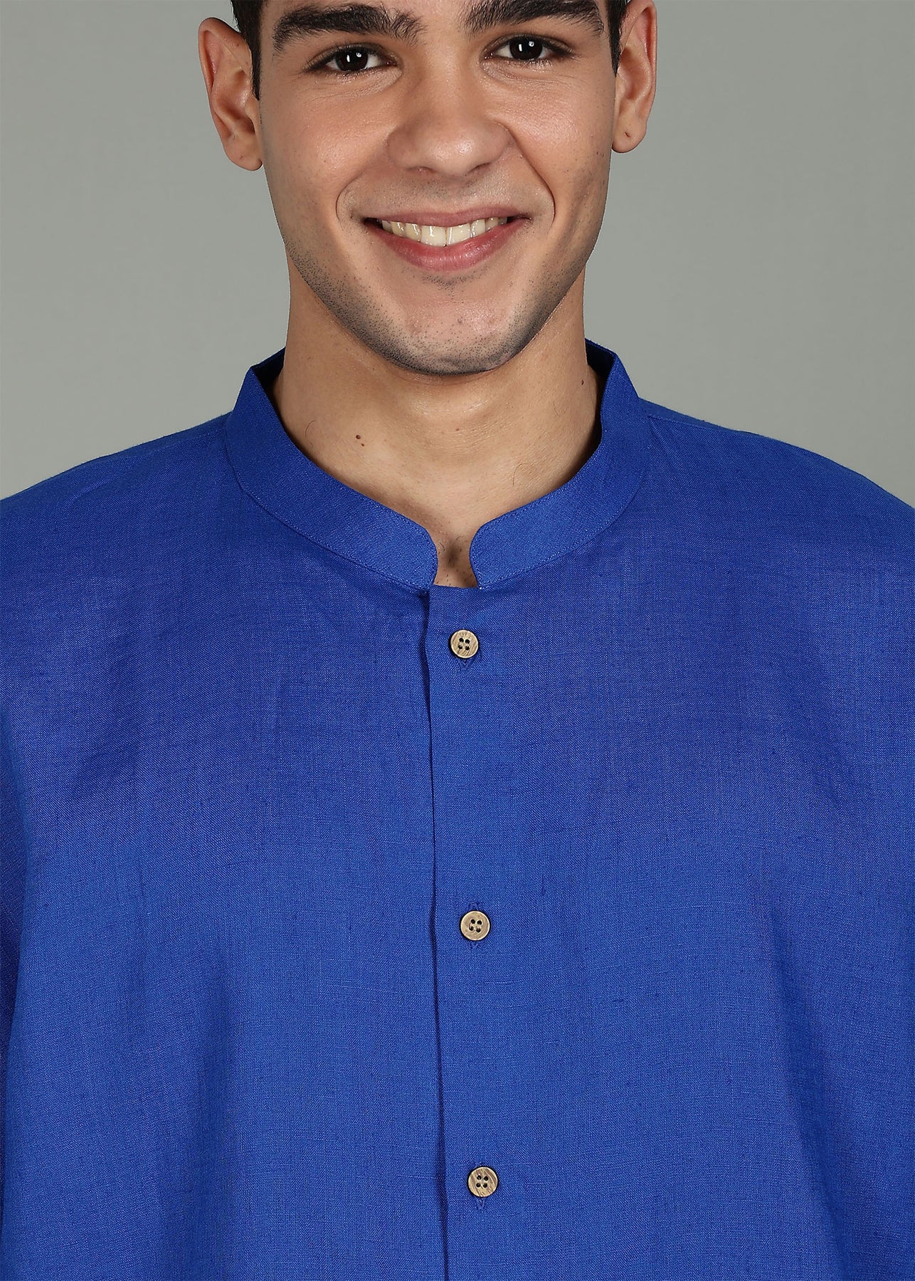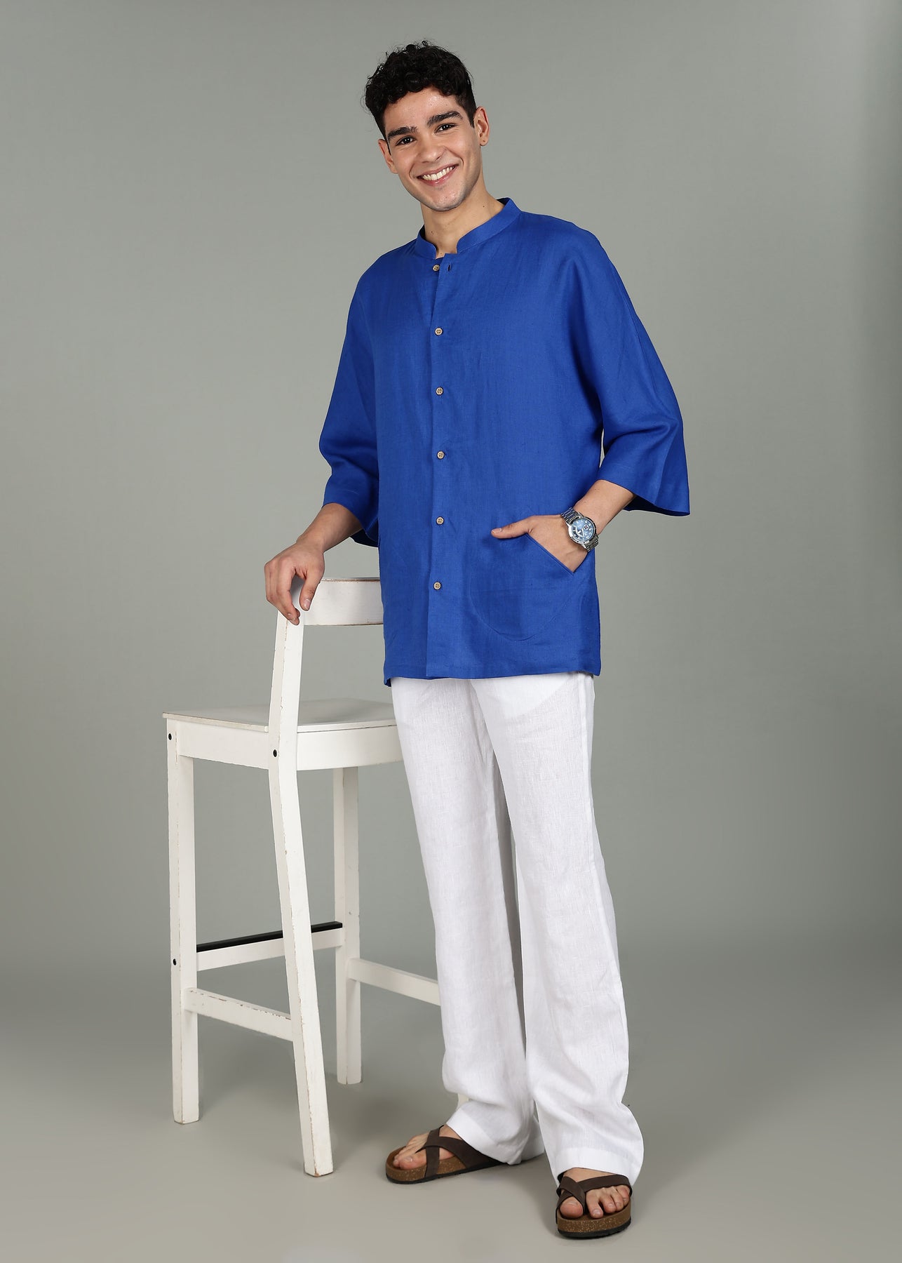 Kenshi Short Kurta Set - Pure Linen Kurta Set with Roy Pants - Egyptian Blue & White