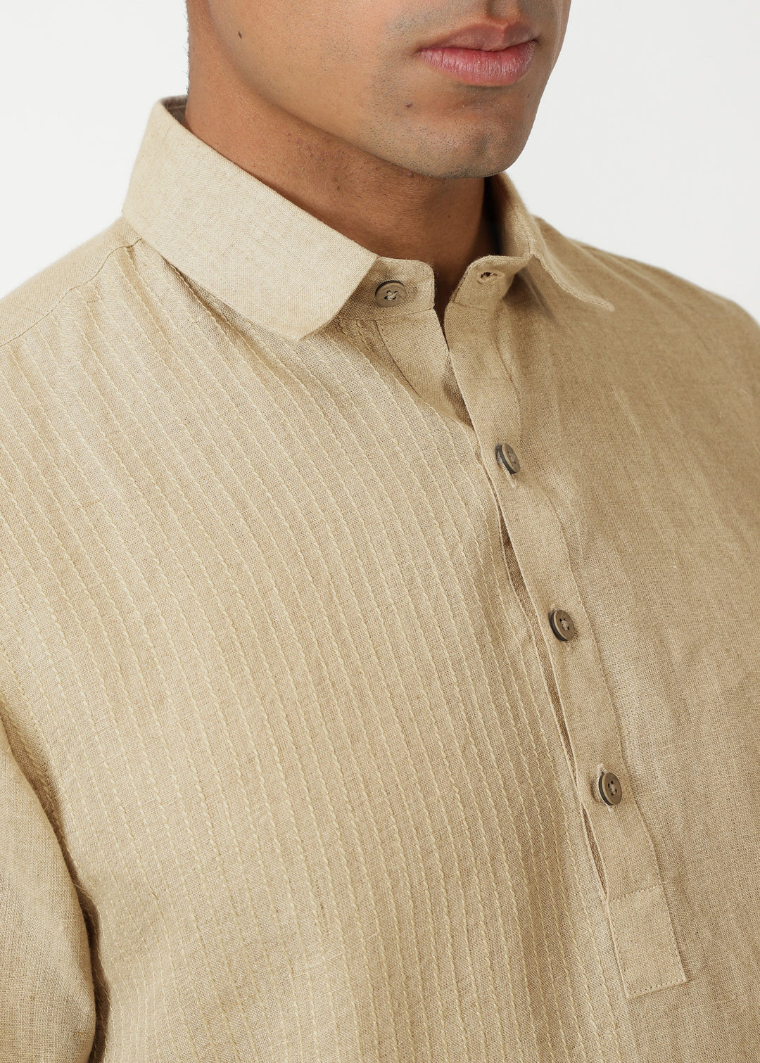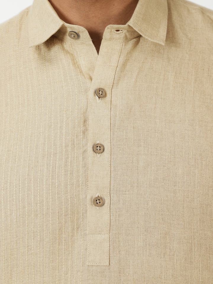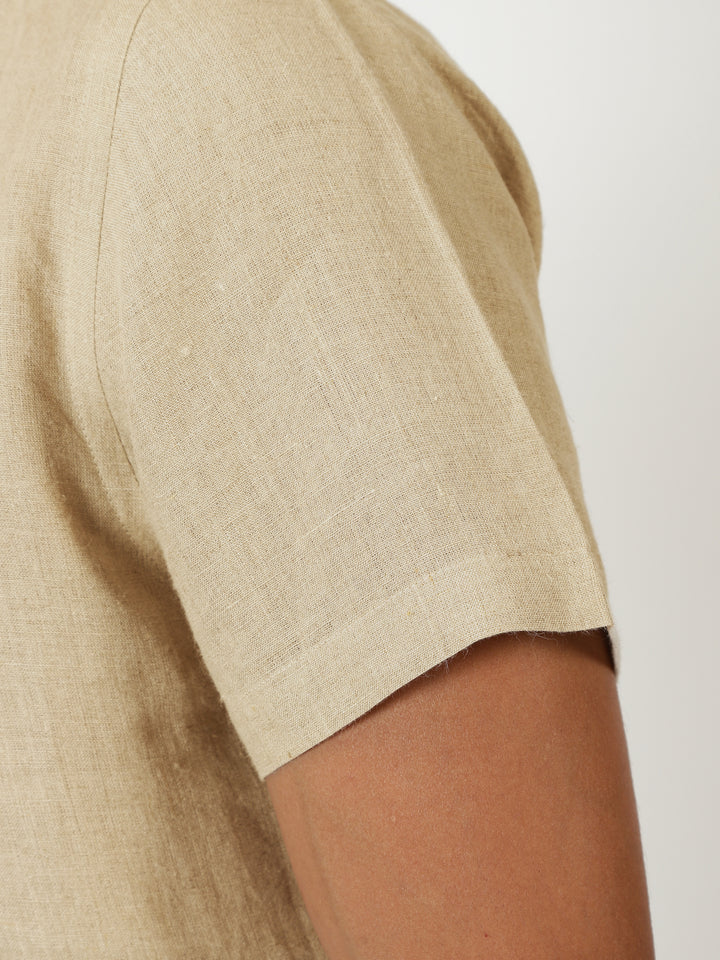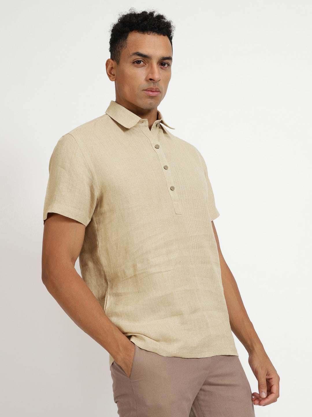 This shirt is crafted from high-quality linen in a light tea-yellow shade, featuring a standard collar, a half-placket buttoned front, and short sleeves. It also has subtle tone-on-tone running stitches for a subdued touch of refinement.